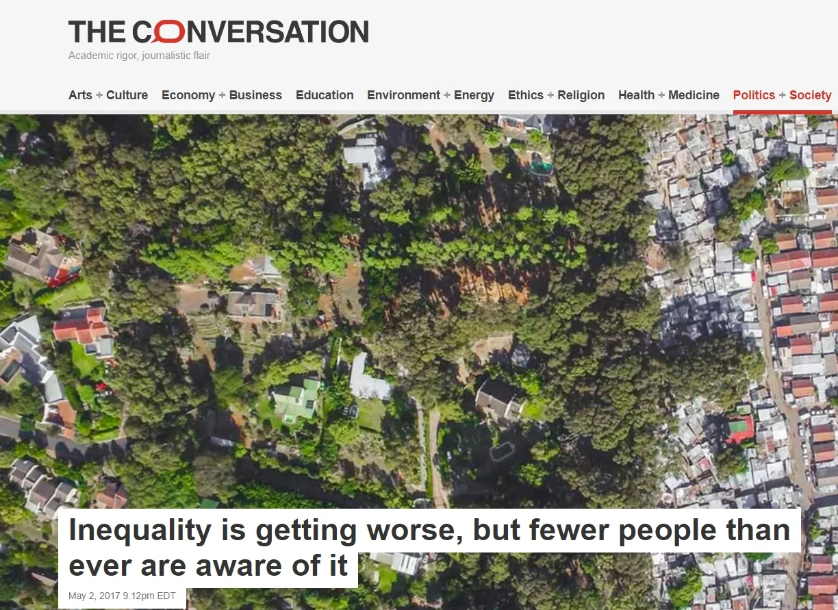 "The UK is no exception to rising inequality. Income inequality is on the rise across the western world, but most people don’t seem to care. My research, published this month in the Socio-Economic Review, is an analysis of 25 years of data on income inequality across 23 western countries including the US and Europe. It finds that, paradoxically, the higher inequality rises, the more people believe that economic success is based on merit. People look at success as the result of hard work and talent and downplay the role of family wealth and connections. Citizens in some of the most unequal countries, like the US, believe most strongly in meritocracy." Read more.
