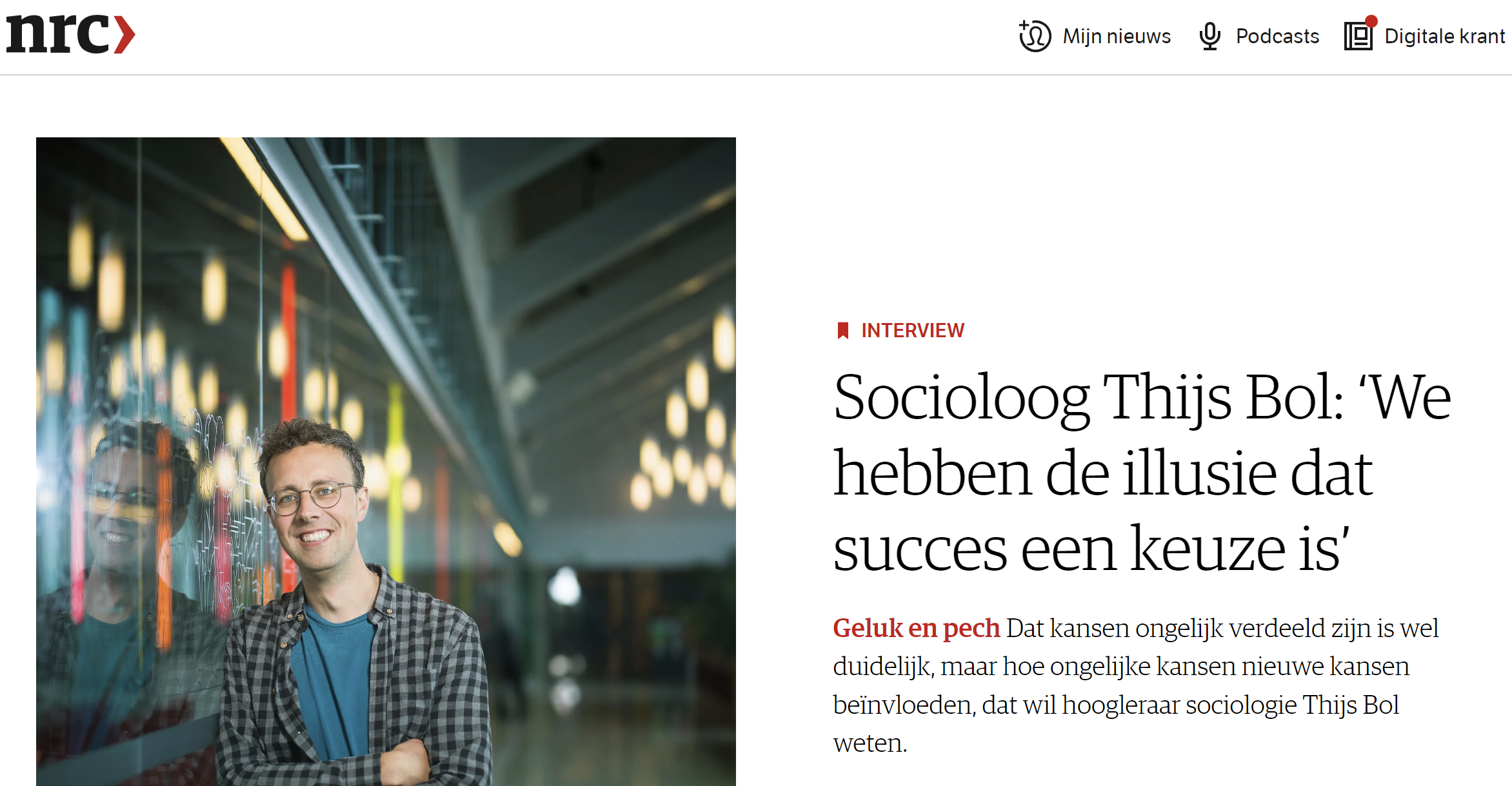 “Jonathan Mijs, een collega met wie ik in Amsterdam gestudeerd heb en die nu in Boston werkt, heeft in zijn onderzoek laten zien dat van de mensen die vlak voor WO II geboren waren, de helft dacht dat hard werken cruciaal is voor succes. In mijn generatie is dat driekwart. Het geloof in de maakbaarheid van succes wint aan populariteit. Je ziet dat ook in trends op sociale media, zoals ‘manifesteren’ [je wensen zo intens visualiseren dat ze zouden uitkomen]. Of ochtendroutines nadoen van succesvolle mensen: om vijf uur opstaan, een uur sporten, half uur ademhalen, dan in een ijsbad – en denken dat je dan ook succes krijgt. Nou, mijn ochtendroutine is douchen, havermout maken en broodtrommels voor de kinderen en dan naar mijn werk.” Read more.