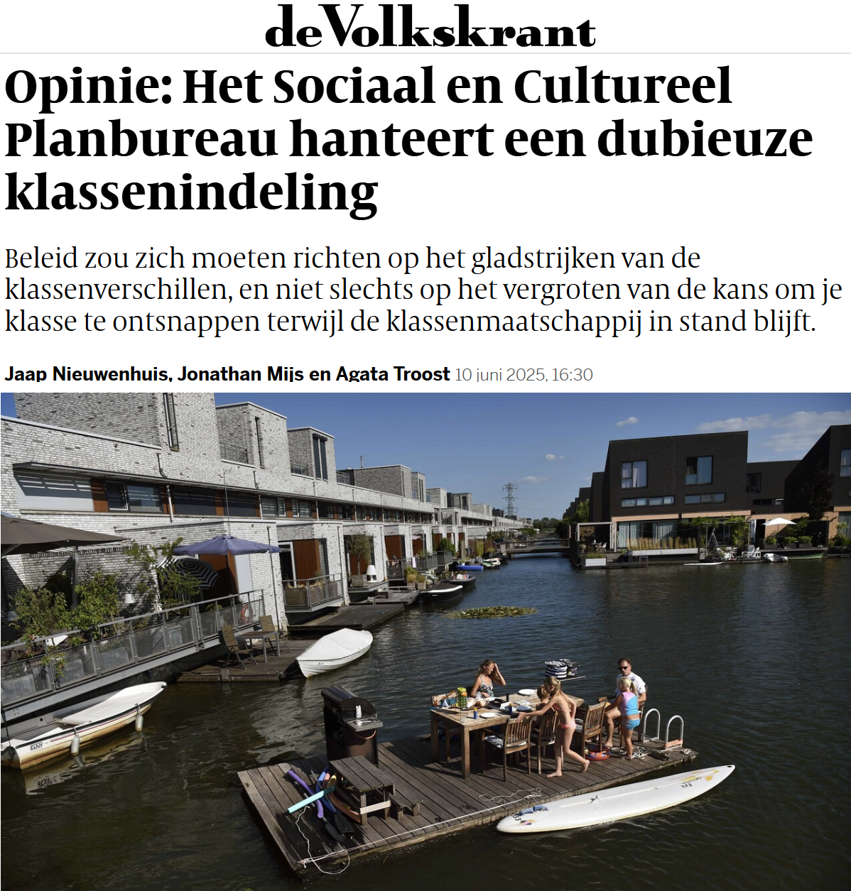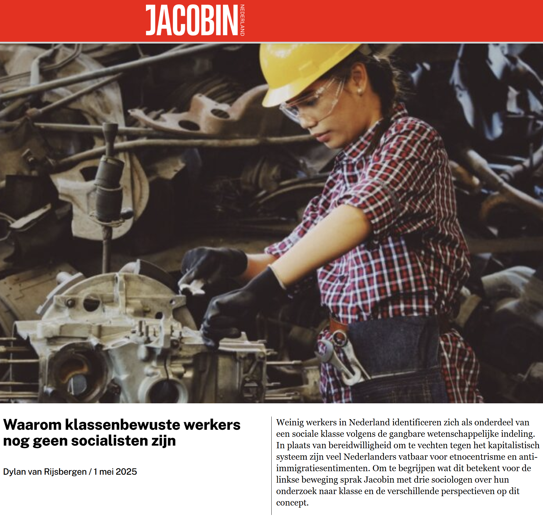 "Als je Nederlanders vraagt tot welke klasse ze behoren, dan geven ze de meest uiteenlopende antwoorden, die zelden iets met sociale klasse te maken hebben. Dat is wat een drietal academici ontdekte in een kwantitatief onderzoek naar klasse in Nederland. Ze zagen ook dat mensen die zich wel in enige mate bewust waren van hun positie als werker in het kapitalistisch systeem, niet per definitie actiebereid waren. Vaak voelden zij zich juist machteloos en neigden ze daarnaast naar anti-immigratiesentimenten. Alleen de groep die echt actiebereid was, had minder etnocentristische ideeën, zo concluderen sociologen Jaap Nieuwenhuis, Agata Troost, en Jonathan Mijs in hun onderzoek hiernaar." Read more.