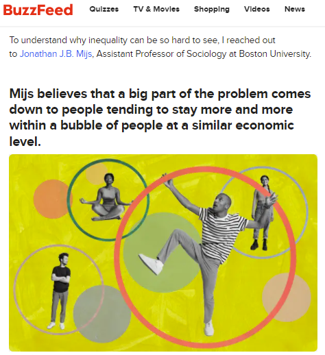 “Mijs believes that a big part of the problem comes down to people tending to stay more and more within a bubble of people at a similar economic level. He says, "Increasingly, rich and poor Americans are living segregated realities: people's workplace, neighborhood and social network mirror their own economic circumstances and level of education, limiting the chances of rich and poor Americans sharing the same spaces and getting to know about each other's lives. This disconnect also means that neither can see their unequal society for what it really is. That goes some way toward explaining why Americans underestimate inequality and overstate its meritocratic nature." Read more.