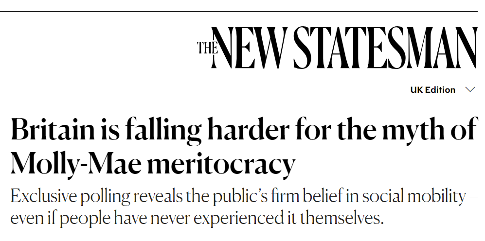 “The discrepancy between belief in (80 per cent) and experience of (26 per cent) social mobility is “striking” in our polling, said Jonathan Mijs, assistant professor of sociology at Boston University, who specialises in perceptions of meritocracy and inequality. “This means that many people maintain a belief in meritocracy, mobility and opportunity even if those things haven’t quite worked out for themselves,” he said. “Beliefs and lived experiences are quite disconnected. Perhaps they believe they will climb the ladder at some future time, or maybe their belief stems from the many stories of upward mobility that reach them through social media, TV and film; the exceptions to the rule that keep their hopes alive.” Read more.
