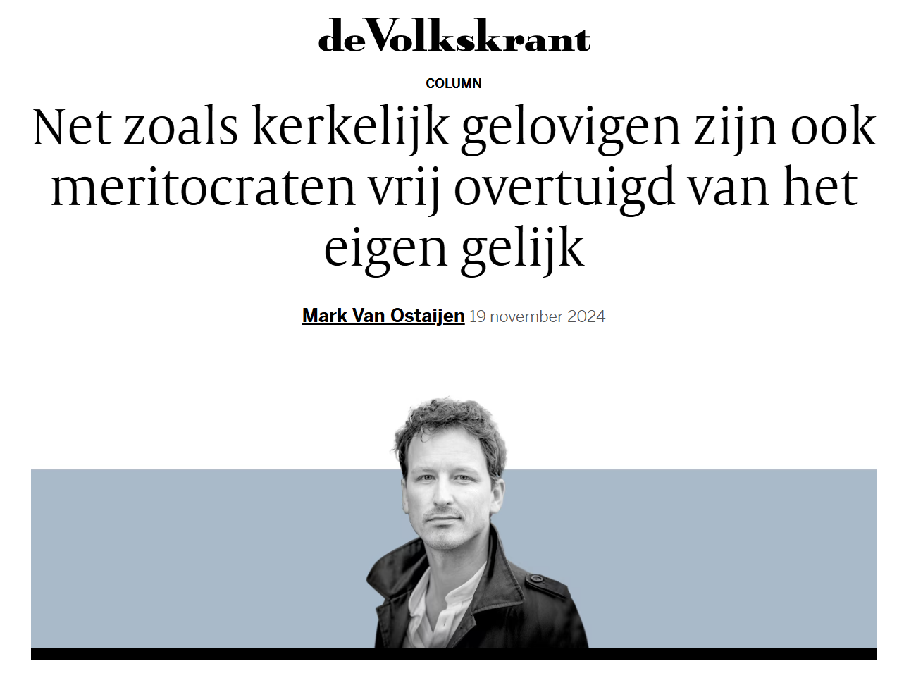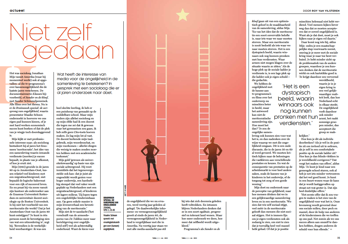 "Zo toont onderzoek van de in Boston werkzame Nederlandse socioloog Jonathan Mijs aan dat Nederland wordt gekenmerkt door een sterk meritocratisch geloof. Een ‘heilig’ geloof in talent, inspanning en verdiensten, een geloof dat succes individueel maakbaar is. Zo geloven aanhangers van het meritocratisme ‘dat inspanning loont’ en dat degene in belangrijke posities dat ‘verdienen’ omdat ze ‘er hard voor gewerkt hebben’. Niet voor niets profileerde onze vorige premier zich als ‘Mark de hardwerkende Nederlander’." Read more or click for PDF.